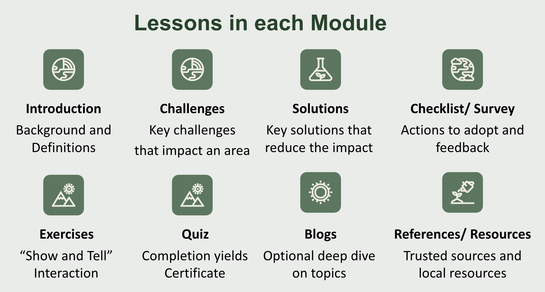 Each module covers challenges, solutions, regulations, standards, technology innovations, success stories, actions checklist, blogs, resource libraries and interactive exercises. Resources include businesses (e.g. farm to table restaurants, refilleries), products (e.g. reusable grocery bags and produce bags) and services (e.g. eco dry cleaning, recycling and composting center) recommendations to help you in your journey to sustainability. Completion of the quizzes will yield a certificate available for display in social media.