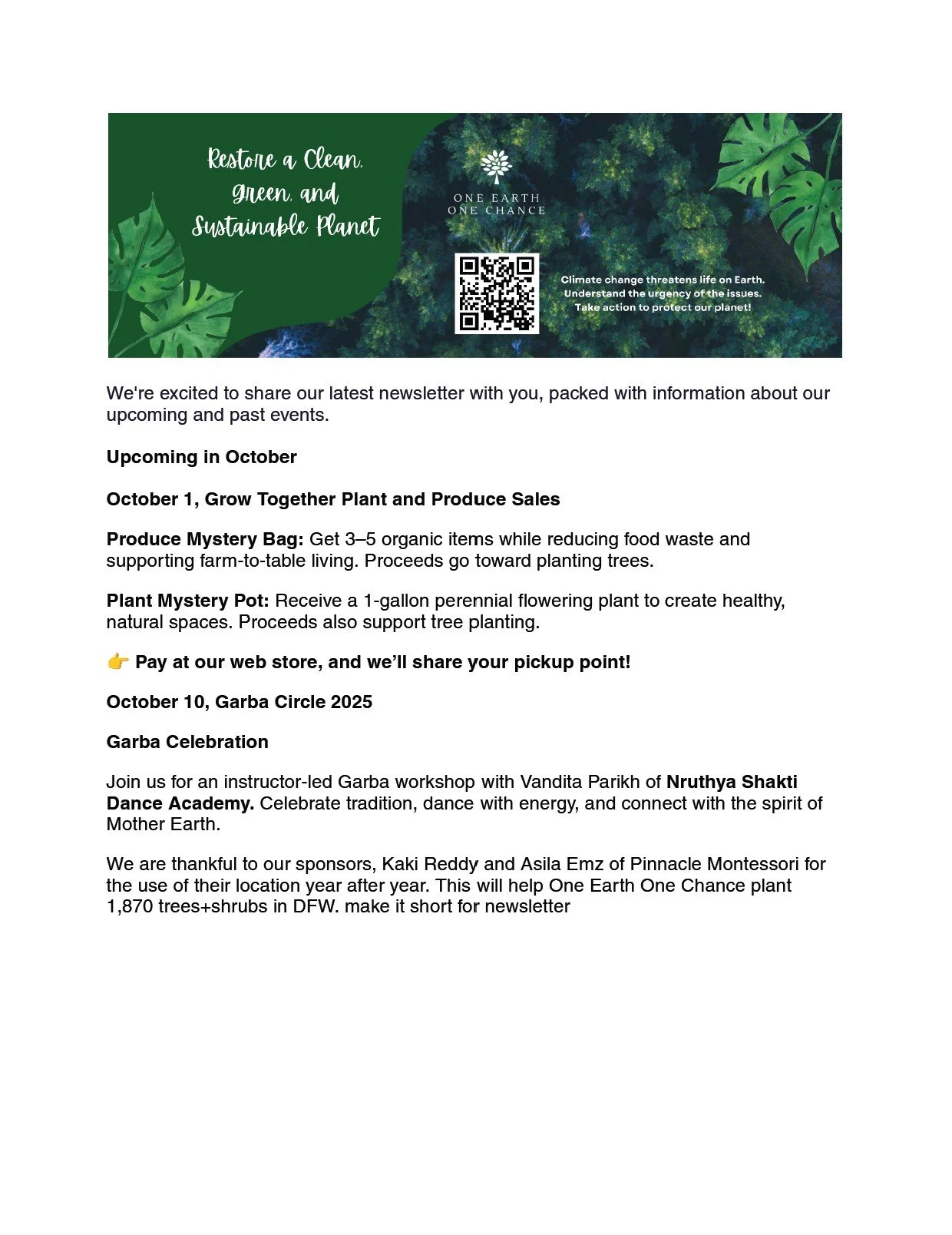We want to thank you for your support of our organization. Your contributions make the earth a greener and more sustainable place. We continue to drive or participate in numerous events to bolster environmental sustainability. Our activities are captured in the periodic newsletters: